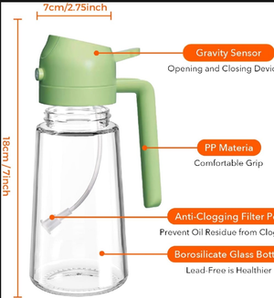 Not Dirty Hands Design: Olive oil spray bottle is designed with the front-facing, prominent nozzle and the rear comfortable handle design enables users to achieve a fine, uniform, pure mist, users can pour or spray oil without getting their hands dirty